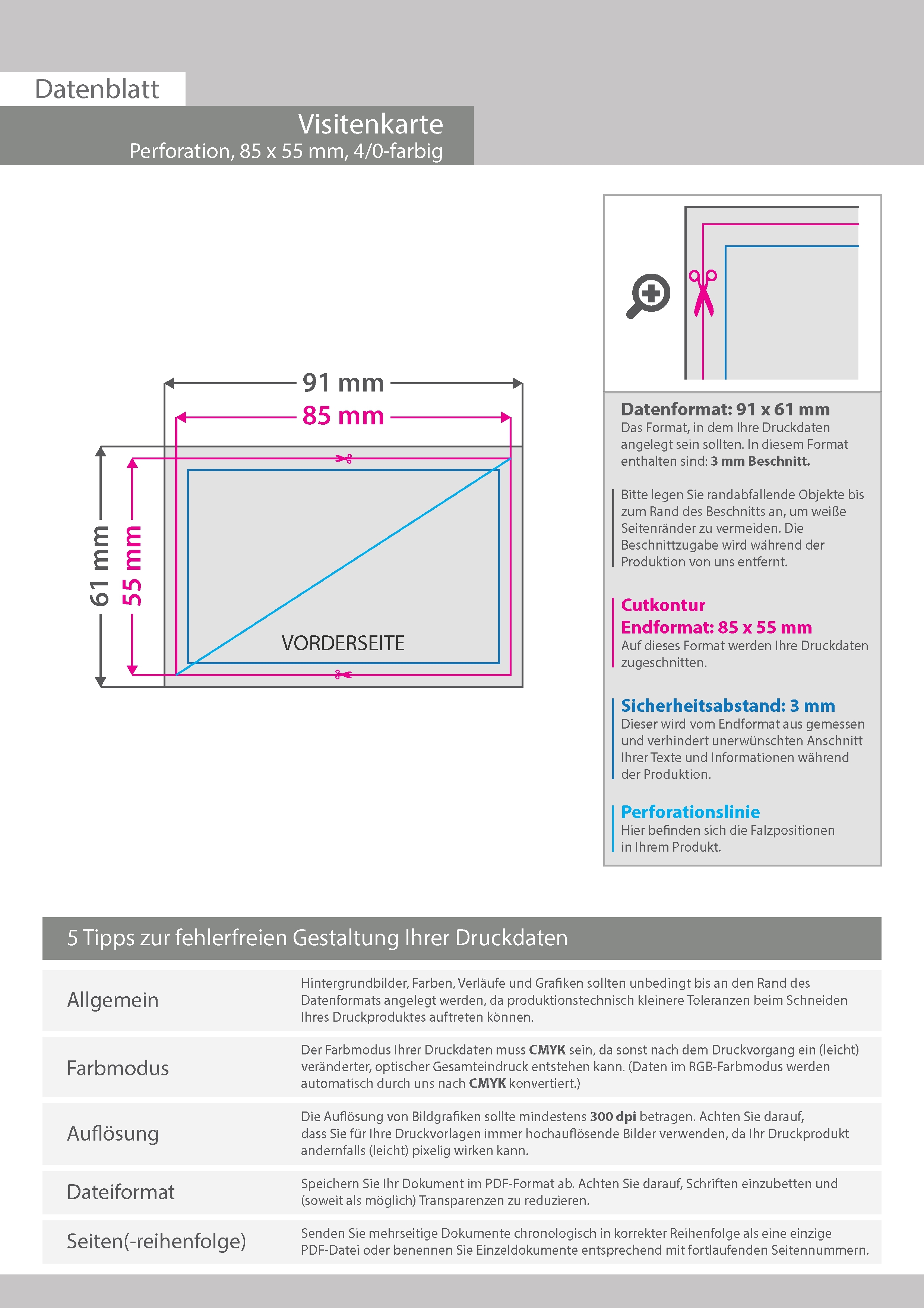 Visitenkarte Perforation, 85 x 55 mm, 1-seitig, 4/0-farbig CMYK